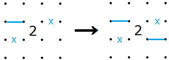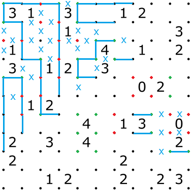 Link to original post : Tutorial: Turning FencesThis week the LMI Puzzle Marathon will start. It will run from February 21st till March 2nd. For this event I have written a Turning Fences puzzle. To prepare people a bit for a more unknown genre, I will write a tutorial about the logic behind the genre. It won't be complete, but it should be enough to tackle the upcoming puzzle. In the next days there will also be a few practise puzzles. You can also practise some of the puzzles already on my blog, but most of these are logically harder than the puzzle in the actual test. For those who happen to own Akil Oyunlari Issue #75, there are also 4 of these puzzles by my hand in there. They are logically a bit more friendly.Rules Draw a single closed loop by connecting dots horizontally and vertically. The numbers in the grid indicate the amount of turns taken on the four dots around it. Basics The puzzle type somewhat looks like the standard Slitherlink puzzles and has some similarities in the layout and the way you have to avoid multiple loops. But that's where the comparison in solving pretty much stops. The solving of a Turning Fences puzzle pretty much always starts on the edge of the grid. This is because knowing that a turn finds place on a dot, still leaves four ways to draw that turn, but on the edge this is reduced to two ways. So to start Turning Fences puzzles you should direct your focus to the edges and corners of the grid. It is important to keep good track of which dots are turns and which dots are not turns in this puzzle type, even if you can't actually deduce the way the loop goes through the loop. Knowing that one dot can't be a turn or has to be a turn, can determine the other dots around a number and give you lines and/or crosses. For this tutorial I will be indicating dots that have turns with green and dots that don't have turns with red. If a dot on the edge has a turn, you can always draw a line away from the edge. If a dot on the edge has no turn, you can cross out this line running away from the edge. If a line reaches a dot without a turn it will always go straight, so can draw the line through the dot and cross out the sides. If a line reaches a dot with a turn, the line will have to run, so you can cross out the segment going straight. If there is a cross next to a dot with a turn, then a line segment can be drawn in the opposite direction. If a cross is next to a dot without a turn, then a cross can be drawn in the opposite direction. That is the basic solving technique of this puzzle type. Numbers on the edge of the grid As mentioned before, the edge of the grid is the starting point of any Turning Fences puzzle. So what can we do with numbers that are on the edge of the grid. The number 0 The number 0 on the edge of the grid is pretty simple. You can draw four crosses as the loop always have to turn when leaving the edge of the grid. The same then goes on the dot one row off the edge. The number 4 The number 4 on the edge has 3 different ways of being drawn. These options all have 2 lines and 2 crosses in common. So you can draw these at the start. The number 2 This is where the logic gets a bit more complicated. There are too many options to draw out on how the turns can behave. There are already 6 ways to distribute the places where the turns are located. But there are some deductions that can be done with a 2 on the edge. The two indicated segments running away from the 2 are always both a line segment or always both a cross. So if the solve forces one of them to be either a cross or a line segment, you can also place the other one. The number 1 and 3 I am doing these together as the logic on the edge for both is the same. Just like the number 2, there are too many ways this number can behave to draw any direct deductions on its own. But just like the number 2, there is some generalised logic to be learned from these numbers. With the number 1 and 3, the two indicated line segments always have one segment being a cross and one segment being a line. As you can see I indicated that the two dots under the cross in the 1 can't have a turn and under the 3 both have a turn. This lets you draw the extra line and cross in the image. Practise puzzle #1 Here is a first practise puzzle to show how the above can be applied. First we look at the 0 and 4 as we know where the turns are for these numbers. We can place a number of crosses and lines.? Now we can look at the numbers to the right of the 0. As we know that one of the segments leading away of the 1 is a cross, the other must be a line. Now we can look at the 2 and deduce that the other segment leading away from the 2 is also a line. Then we look at the 3, where we know the other segment leading away from the 3 must be a cross. We also know where two of the turns around this 3 now go and we can mark these as turns. We can do a similar thing with the numbers to the left of the 4, leading to the given lines, crosses and no turns. Now we can look at some of the other numbers. We can see that both 3s on the right already have one dot marked as not being a turn. This means that for both the remaining three dots must be turns. Now we have both 2s on the left with two turns marked, so we know that the other two dots must not be turns. Now we know how those dots behave, we can draw the given lines and crosses. When we look at the right, we can see that the top 1 already has one dot marked as being a turn, so we know the other dots can't be turns. This means we can draw a number of crosses and lines around the 1. If we look at the 1 below, it has one cross leading away from it, so the other must be a line. IF we then look at the 2, we can see it has one line leading away from it, so the other segment must also be a line. The same now goes for the 2 below that. Now we can draw some more loop if we look at the bottom right. The lines around the 4 must escape to the right and left. To the left it has to connect to the line betw